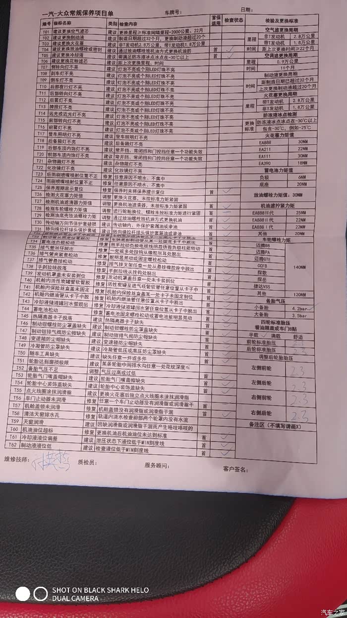 2020年8月26日提车,转眼间大半年过去了,买车的时候全款厂家搞活动送了5年10次基础保养,首保是行驶5000公里或者半年左右。刚提完新车从老家跑两次高速回来去做的首保,当时里程表显示行驶3200多公里就去做了,我也没有预约直接去的大众售后,接待做好登记帮我安排,把车子开到车间里让我在休息室等候。