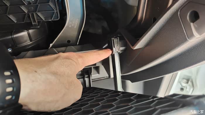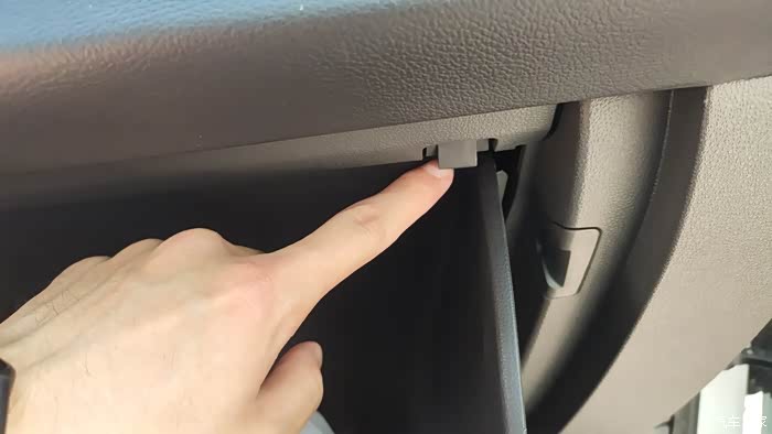 将手套箱继续向下倾倒,注意点阻尼器的行程,过了行程,手套箱会一下子扣过来,这里要注意,用手扶着点。