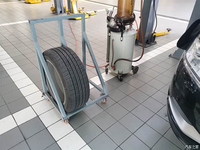 看到尝长长的管子,把每个轮胎的胎压补充一下,