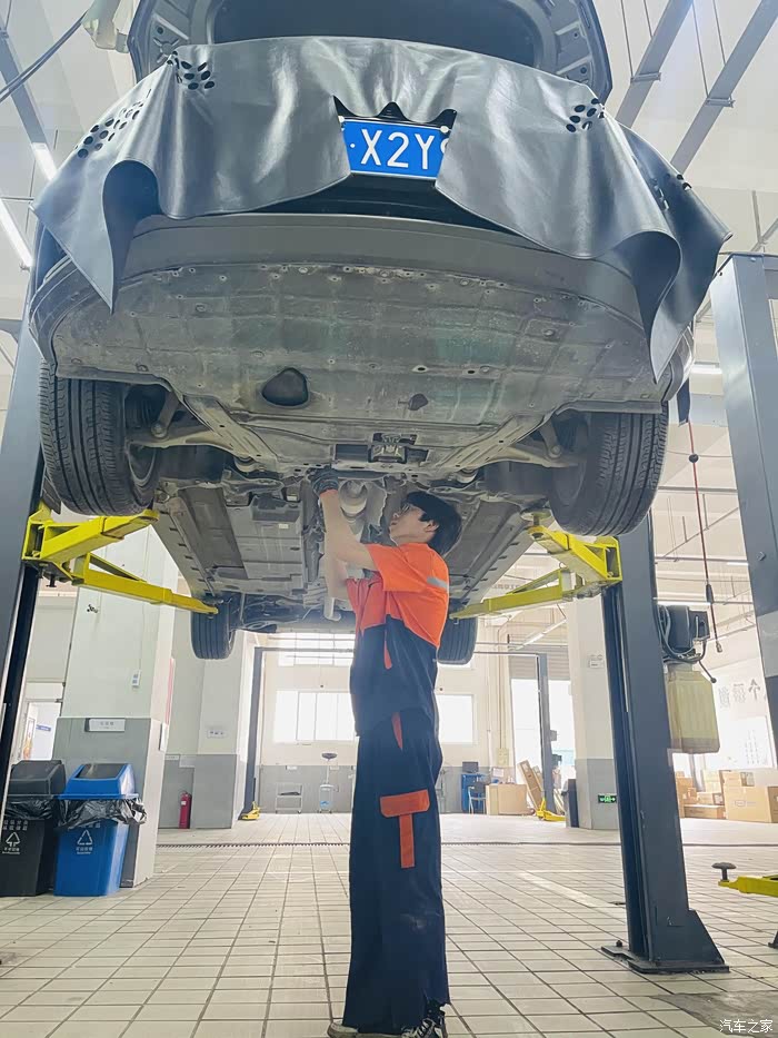 到了后车辆登记好升起来,机舱盖板已经检查后拆卸完成了,升起来开始拆底护板开始放机油!