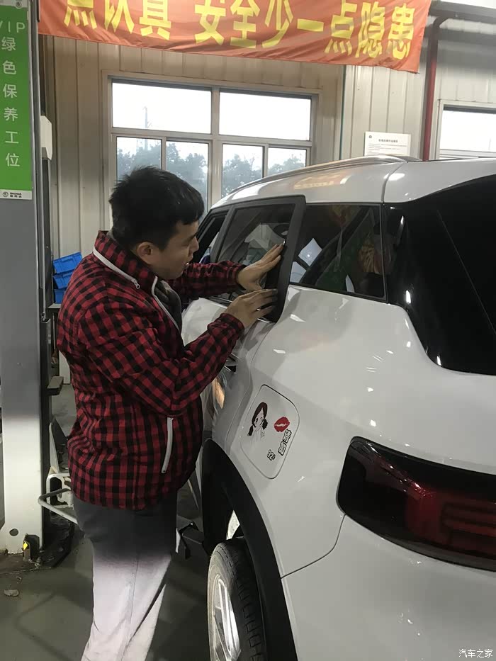 图中的君哥准备帮我贴晴雨挡,贴之前,细心的擦掉车上浮灰,让车与加装的零件更加吻合。