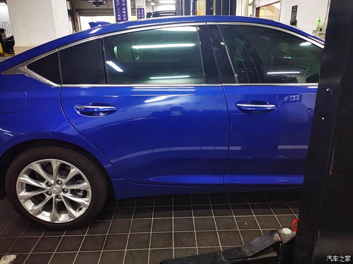 车子被抬高了一米多,检查车况。我选的这个蓝色的车身,看上去比较抢眼,车漆在室内也是光泽亮丽,挺好看的。