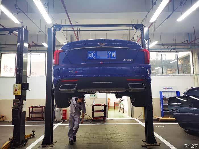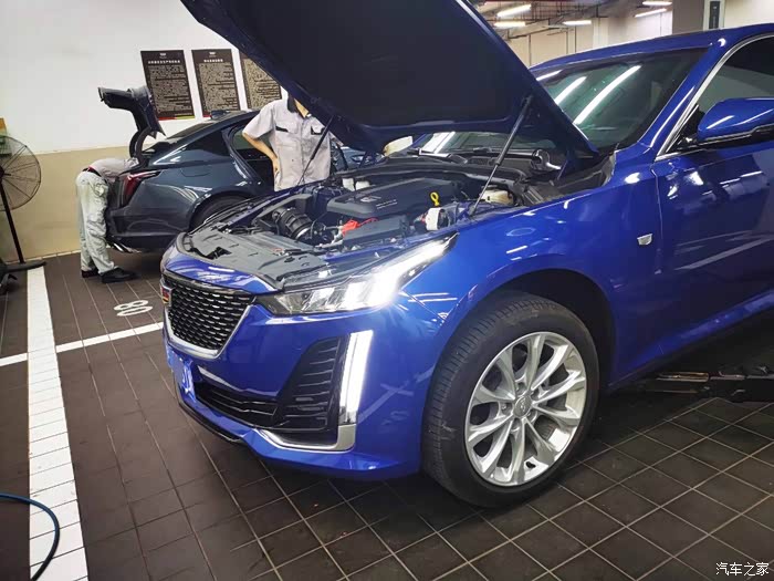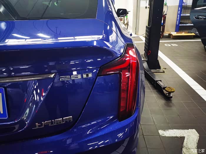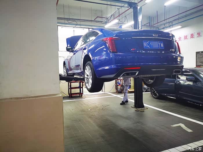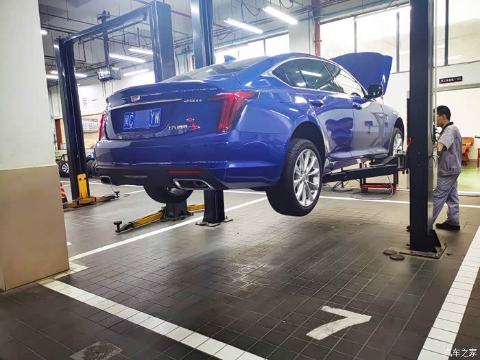 第一次来保养,车间看上去还是比较干净的,我的CT5服务人员帮我开进去,感觉还是挺暖心的,车子停靠在里面,开着车灯,外观看上去挺帅气的。