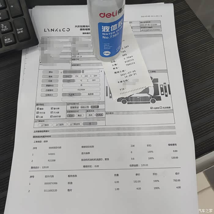 到此我的领克05的首保全部结束,重点感谢售后亮亮还有2个忘记问名字的售后师傅!换完新机油后,感觉发动机的运转似乎更平顺了,声音也变得比之前更加沉稳有力,不知道是不是因为换了新机油的心理作用!不过大庆世腾领克的售后服务,给我的整体感觉,还是非常棒的!1W公里后再见啦~