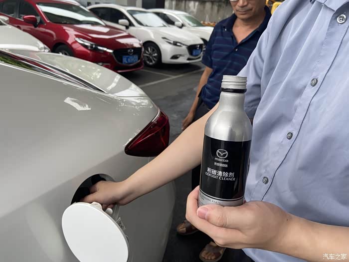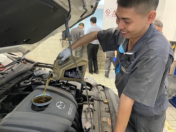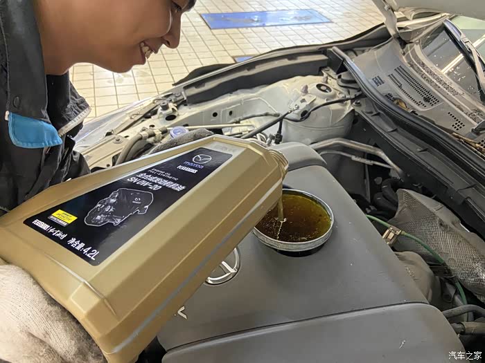 添加新的机油。我用的是马自达专用的全合成发动机机油,一桶机油没有加完,还剩大概0.2L左右。
