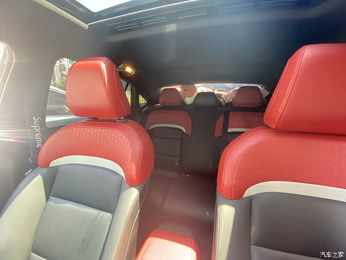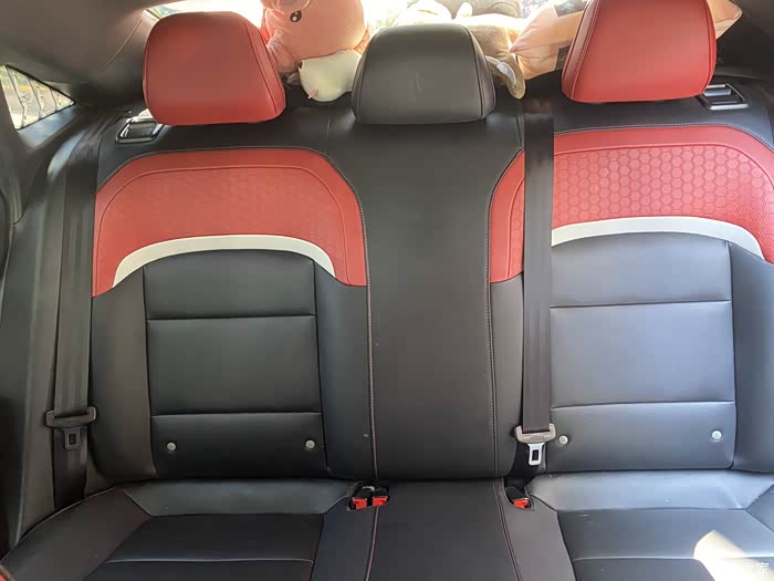 下面来看看后排,内饰红黑搭配,运动十足。