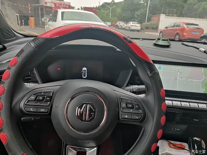 内饰部分,报包了一个比较运动的红色方向盘套,看起来很棒。