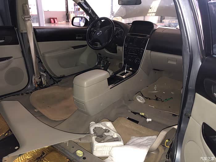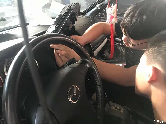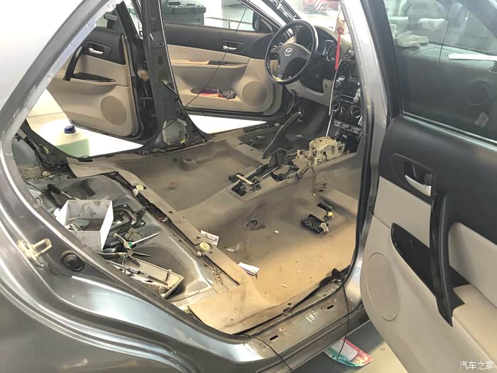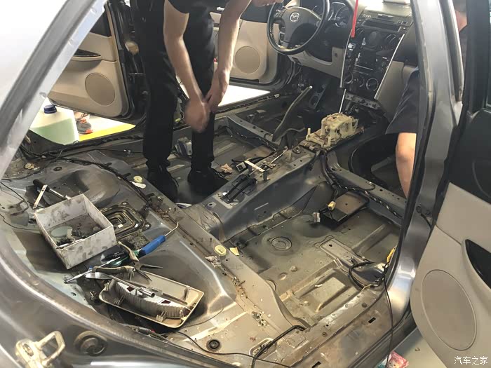 拆除地毯,彻底的清理杂物,固定线路,值得一提的是,10年老车无一锈点,线路插头固定良好,为马自达点赞!