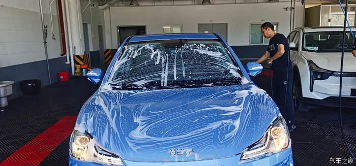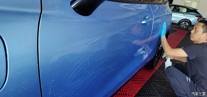 全身洗完了泡泡,然后冲完了,现在用细细的特殊泥对车漆进行细部的清洁工作