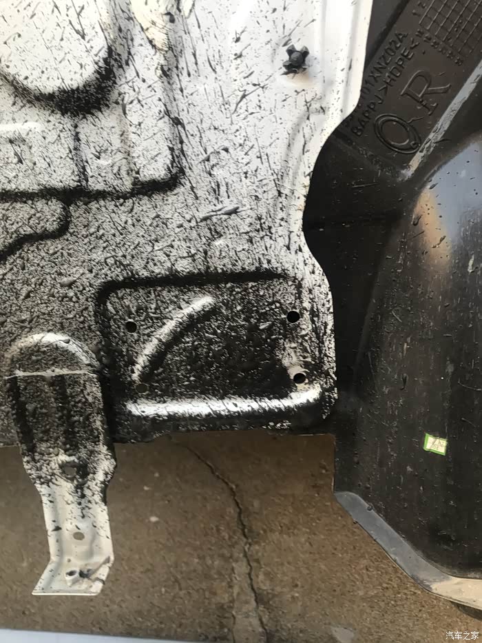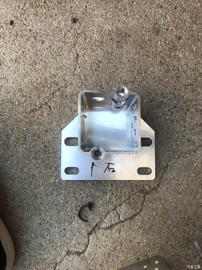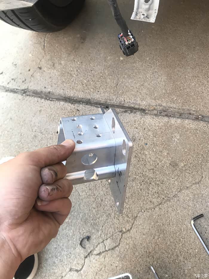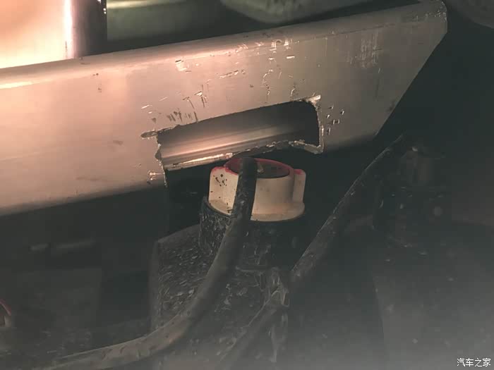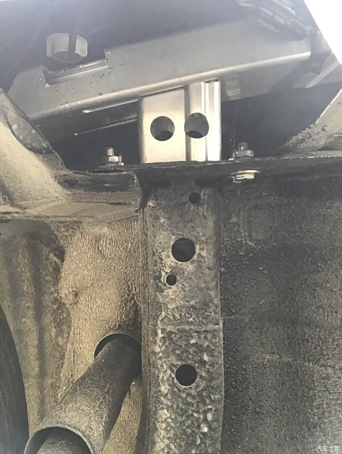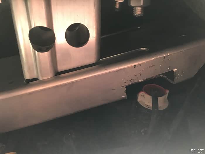 左下角的孔是原来的孔,正好用上,其他三个空是我根据底座钻的。在厂家预留的这个位置钻孔,配合巧妙的底座,吸能盒就正好顶在纵梁上。如果吸能盒在底座中央,那开孔就得上移,详见黑猫大神的帖子(致敬)。