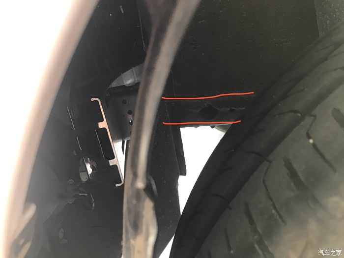 侧面看,吸能盒的高度也正好。(红色标记是车尾的纵梁,口径比吸能盒略小)