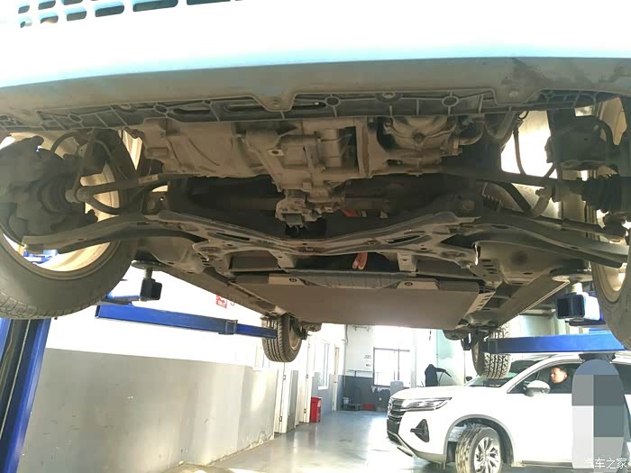 等我在前台和接待人员在电脑保养系统上确认完保养项目以及收费价格等等信息后,车间师傅已经通过车辆obd接口检查过了动力电池数据。正在做车辆的底盘检查。