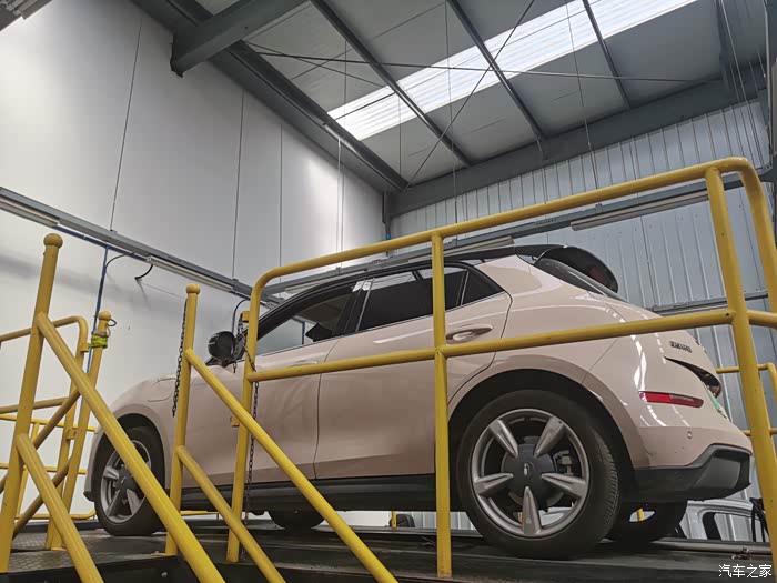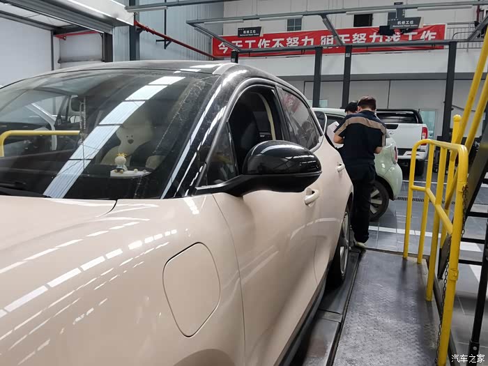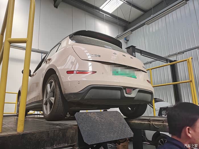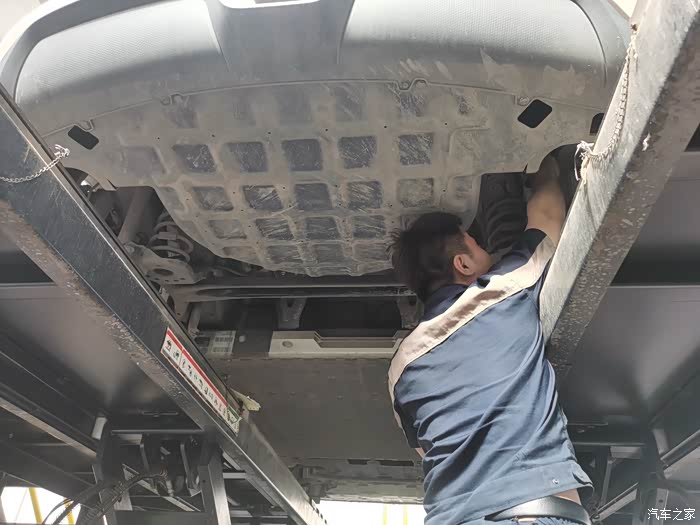 趁着可以把车上高,趁机看看了底盘下面的结构,因为是电车,所以底盘不像油车发动机那样,直接就是一块平板的,这样也觉得过大坑什么的,不会碰到。师傅主要检查了两边的减震垫的。