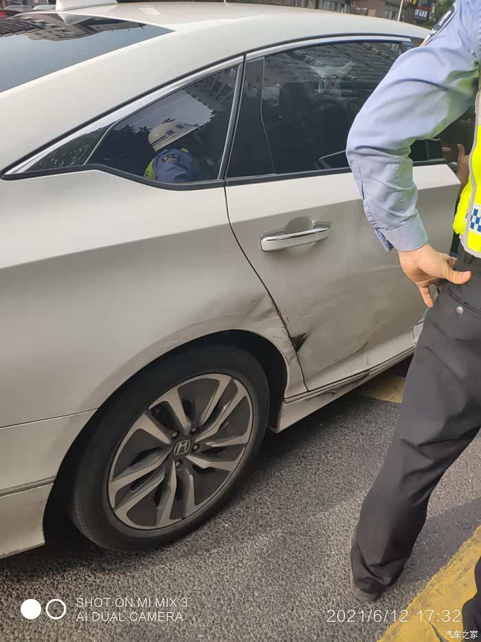 上周在路上行驶的时候,路况不好,堵车,前方有辆车在最左侧车道,然后右转车头侵入我的车道,我向右轻打方向绕开,但是对方还是踩了一脚油门油门顶到我左侧,保险杠花,翼子板凹陷,车门刮痕。对方右后翼子板,门,迎宾踏板和反光镜报销了。接下来我结合图片和文字向大家描述下发生事故该怎么处理,给没出过事故的车主老哥科普一下。