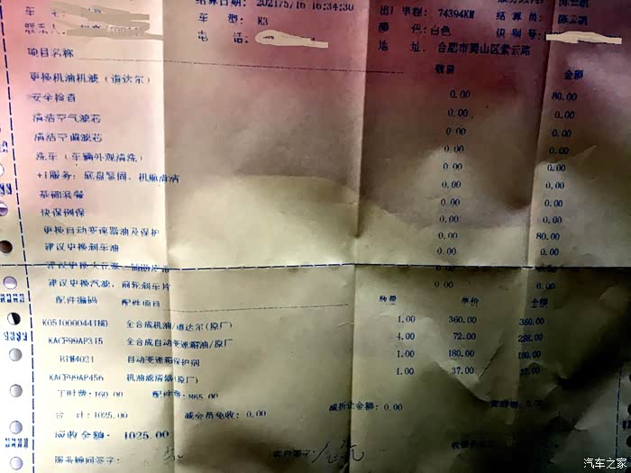 换机油、机滤、自动变速箱油、变速箱保护剂总共1025,工时费占了160快用拳抵了后交钱865。还算可以,毕竟下次来保养机油不买了,工时费还可以抵,只要买个机滤37就完事了,还能顺便洗个车。所以有时有些额外但不贵的项目我也就让4S赚点了。