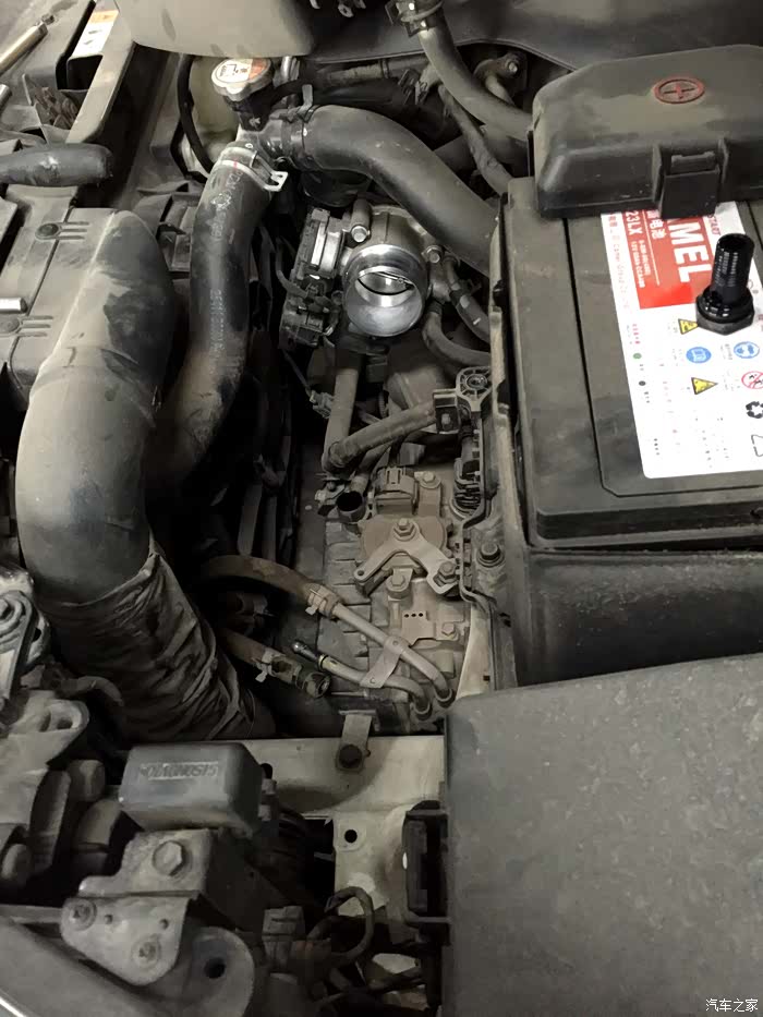 露出了节气门,半年前保养得时候刚清洗过,现在一圈又黑了