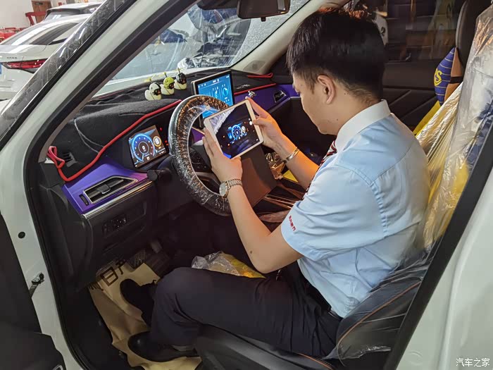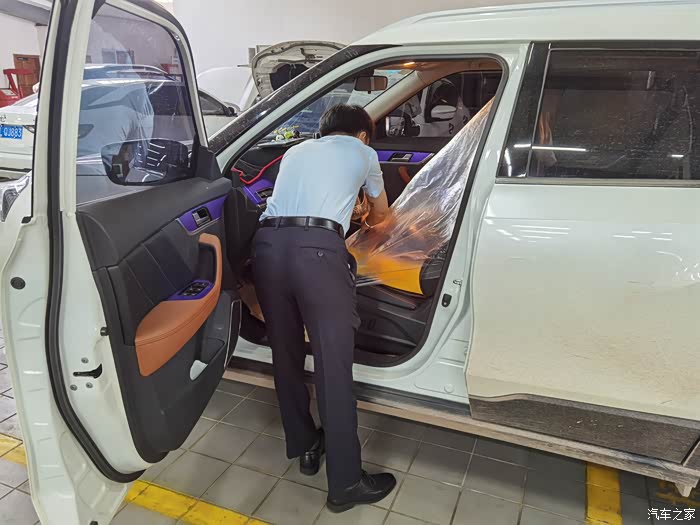 方向盘也戴上了,拍照登记,才能开始保养。