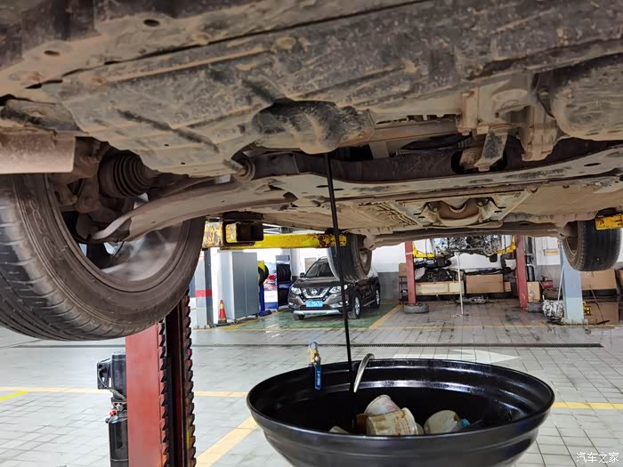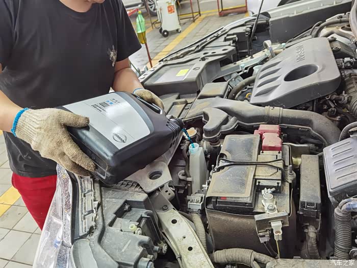 下架后,开始更换新机油,是日产的超级全合成机油,金黄色的,有点像平时家里的食用油,这是给小六吃的油,哈哈。