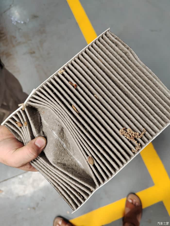 看看下面这个这个空调滤芯也是脏的不行呀 这两个滤芯换下来还不便宜 ,师傅胡巴的空调滤芯是N95 级别的所以可能价钱会贵一点。