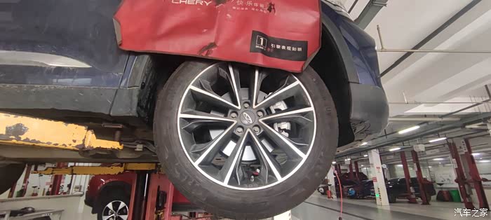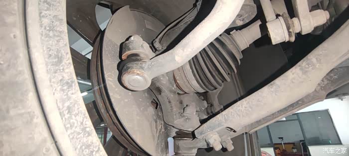 硕大的轮毂19寸,在举升机上跟我头差不多高度,能很清晰的看到轮胎状态,235/50R19马牌轮胎,整体状态挺好的