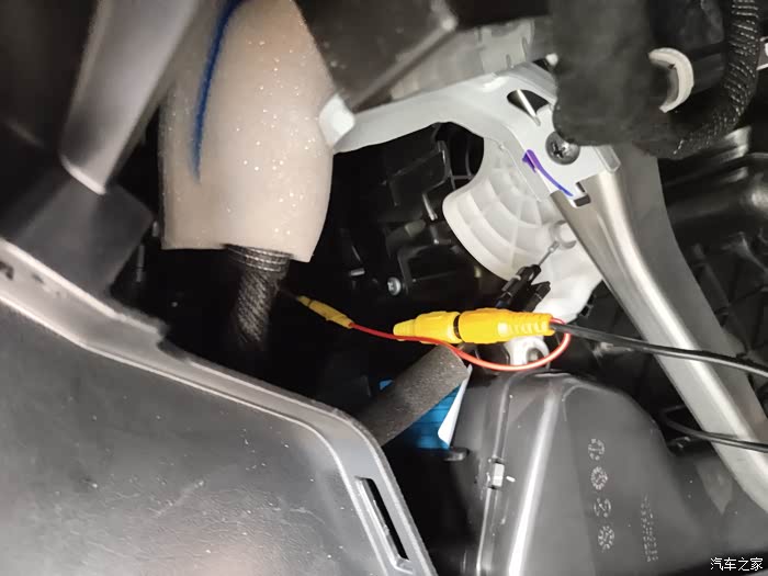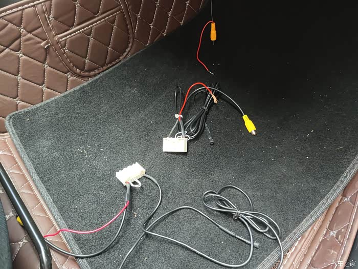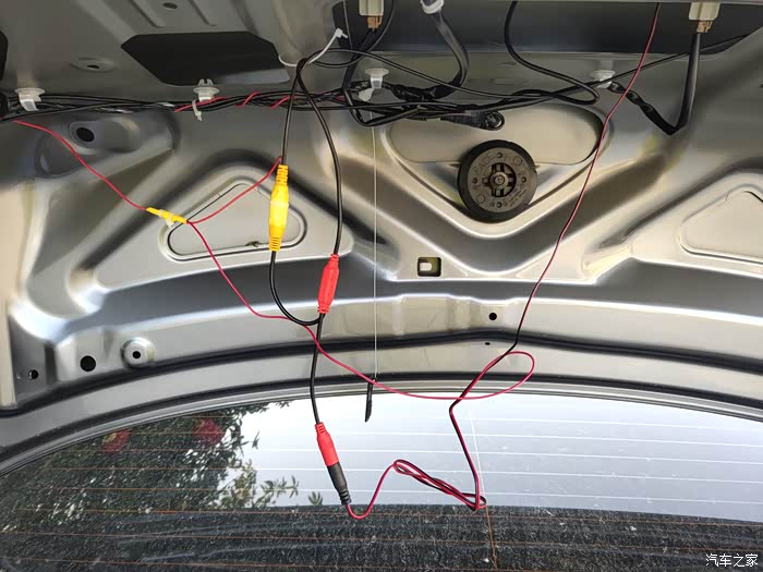 车尾的接线,很简单。黄色和红色的连接摄像头。两个红的一起接倒车灯(找到倒车灯白色的就是直接破线接上去就可以了),黑色的是负极搭铁找个螺丝拧上去就可以了。