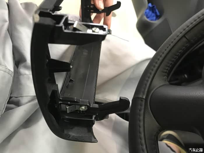 这是手套箱拧开6个螺丝后的效果,拆开的目的就是接下来要拿着一字螺丝刀顶着右侧中间的卡扣,