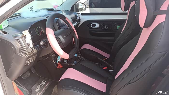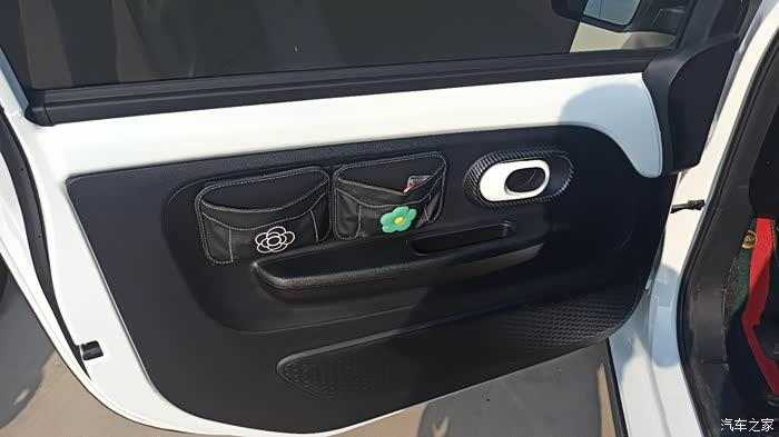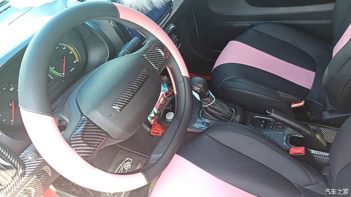 【改装】首先白色的车身颜色过于大众化,贴了一套亚光绿车贴,黑色车顶。这样颜色更亮一些,方向盘和座椅也重新包了粉色坐进去感觉整个人心情都好了不少,两个门都加了储物袋,平时一些小东西都可以放了。