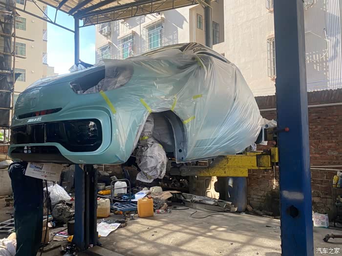 将车身外观有颜色的用保护膜包好,就开始喷底盘漆