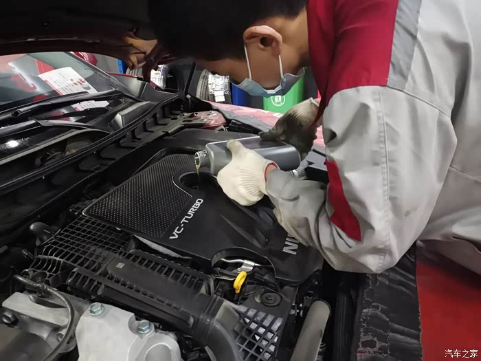 开始加机油了,机油加进去是黄色的,开5000公里之后又会变成黑色了。