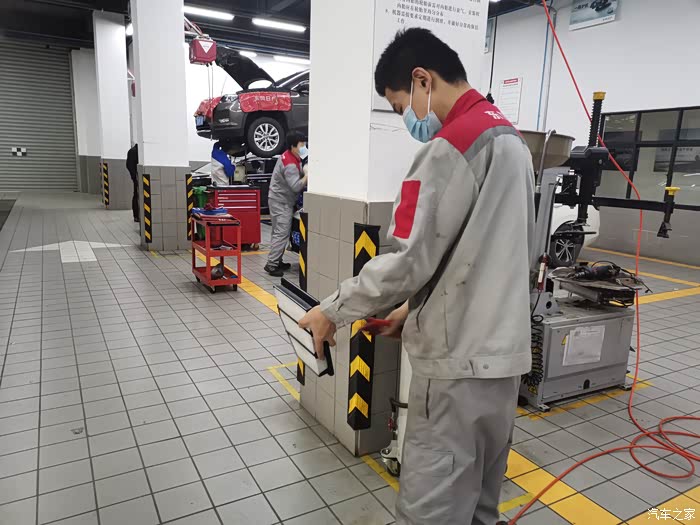 检测完胎压,师傅又开始挑石子了,4个轮胎都挑了一遍。我觉得这项工作非常解压,平常闲着没事我也会拿个螺丝刀挑,但是车停着不太方便,这样把车顶起来就方便多了。