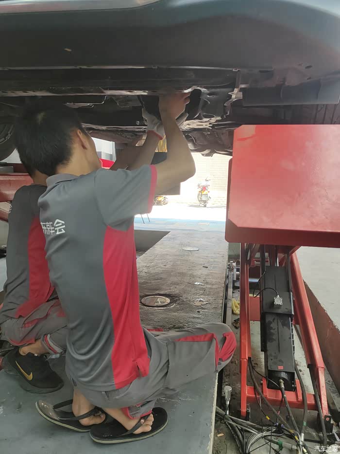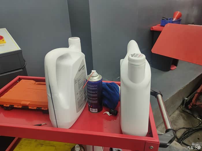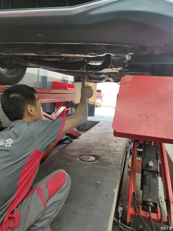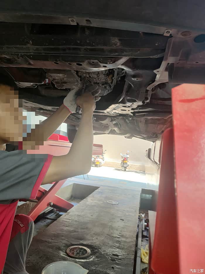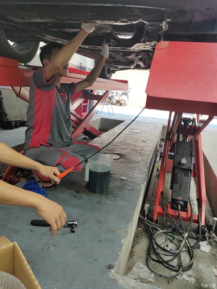 底下装好后加入新的变速箱油,加了大概4升多一点吧,一桶是不够的。师傅还问我,要不加一桶就算了,差一点没关系的,我坚持要加到它刚好放出来的量,毕竟已经过了7天无理由退货了。咳咳,重点是我不知道少了这一点油会不会出什么幺蛾子
