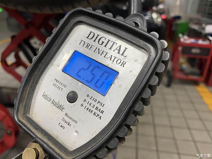 检测胎压,正常值是2.5公斤吧。不过比标准的还是稍微高一点,不论什么路都可以兼得。
