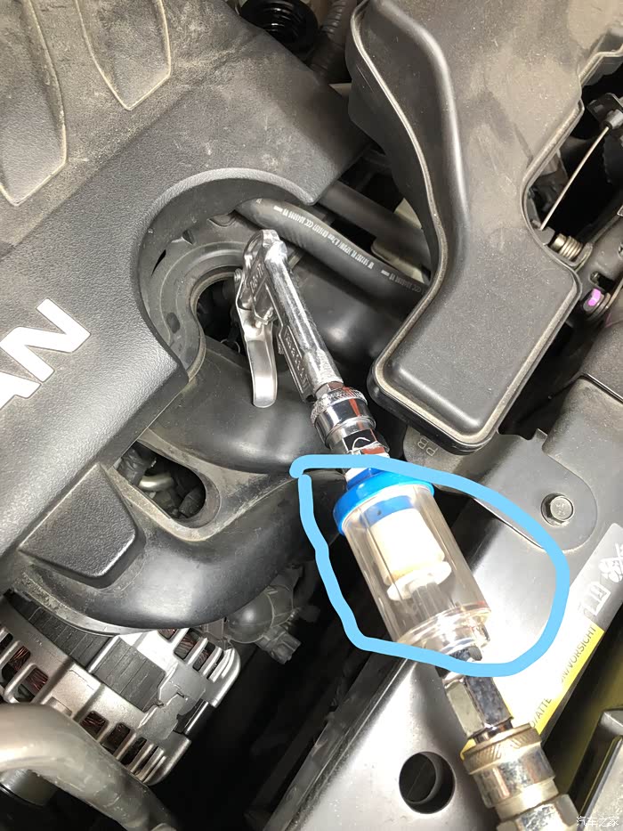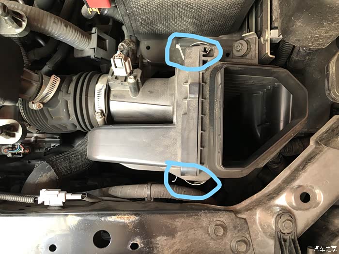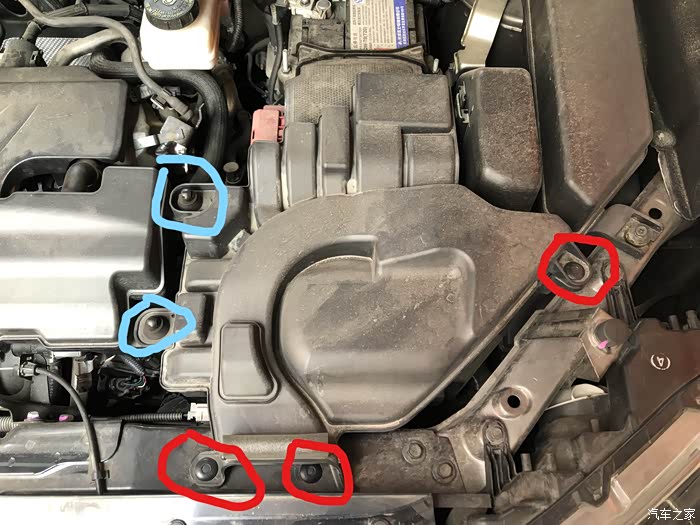 更换空气滤芯,不得不吐槽一下日产的设计,估计日系车之中,最难换的就是奇骏了,进气箱共有5处固定,蓝色标注的是软胶圈,很容易拔出,红色标注的是卡钉。