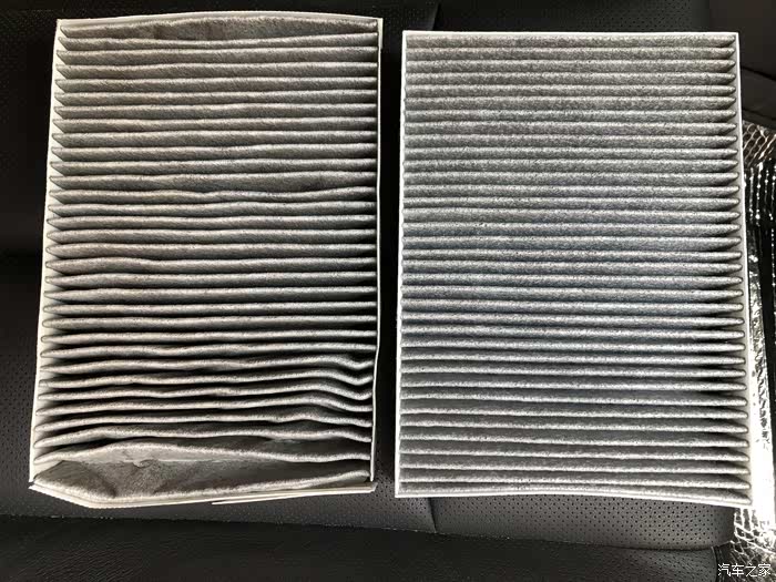 新旧空调滤比对,左边旧的,拿出来已经变形了,其实不算脏,活性炭空调滤都这种颜色。