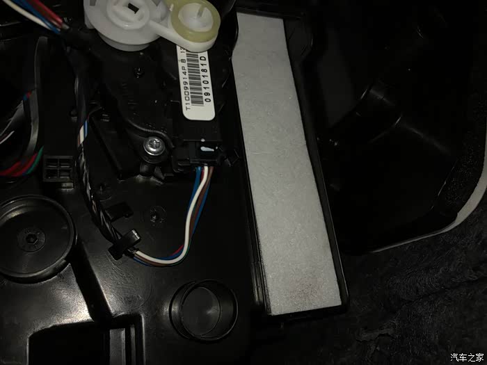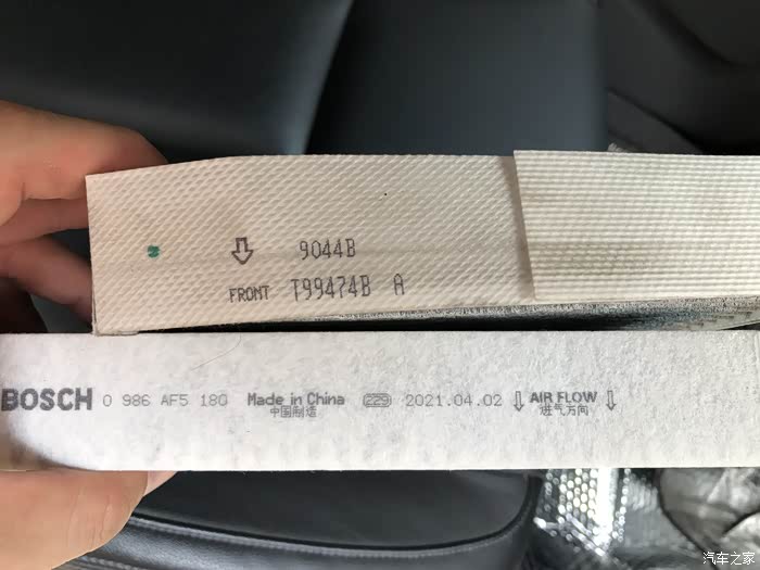 拆下盖子,空调滤就看到了,要注意记住空气流向,空调滤的盒子开口是比空调滤芯要小很多,所以只能把空调滤芯捏扁捏变性才能抽出来。服了这设计。