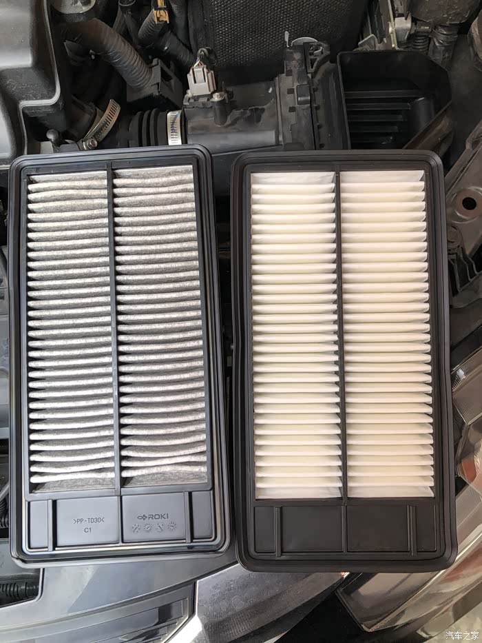 新旧空滤对比,注意的是,19款之后的奇骏2.0空滤是跟之前款的不同的,装回去就不拍了,照样困难,一点一点塞回去,塞回去后要检查边缘是否完全闭合。