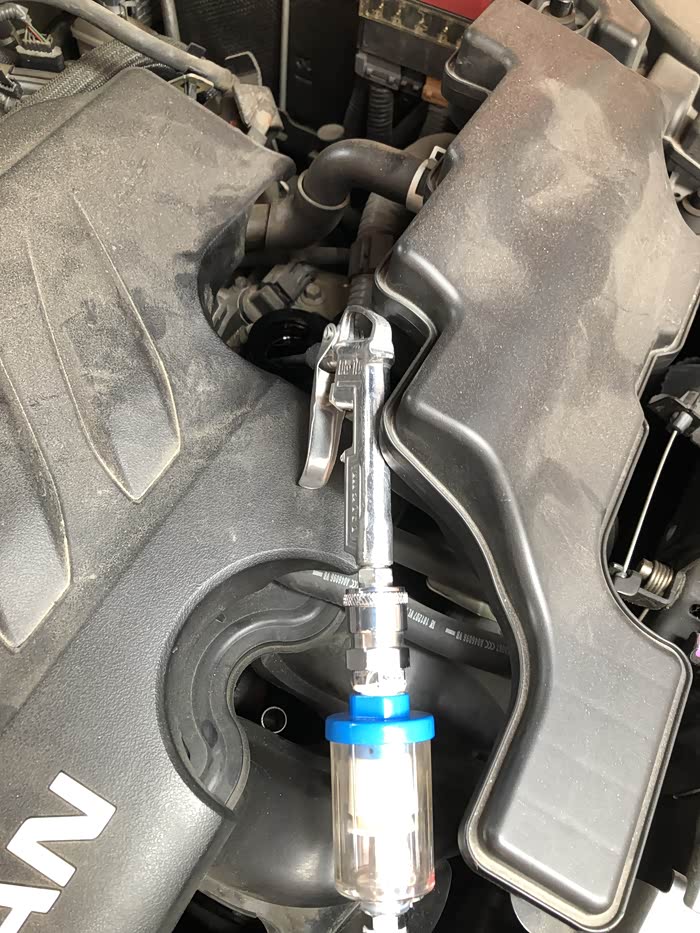 吹完油尺孔接着吹加油孔,这样能吹出很多残留的机油。
