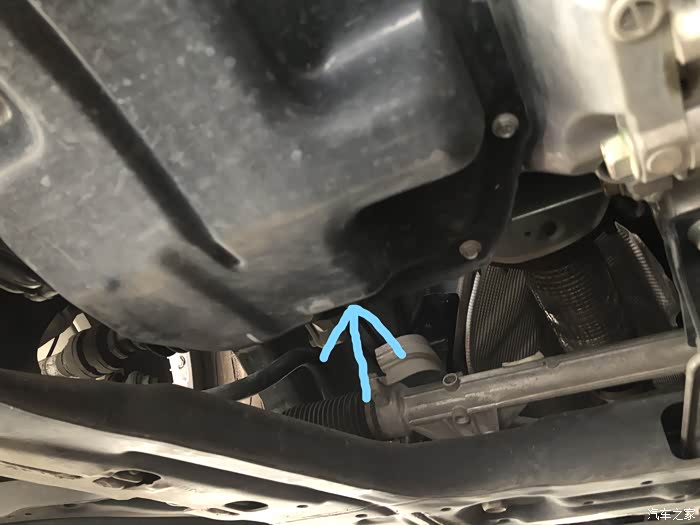 要找到发动机油底壳放油螺丝,首先得区分哪个是发动机油底壳哪个是变速箱油底壳,因为发动机油底壳和变速箱油底壳都是铁的,发动机油底壳还是比较好判断的,标注位置就是放油螺丝,螺丝在侧面不是在底部,这个角度拍摄不到螺丝。