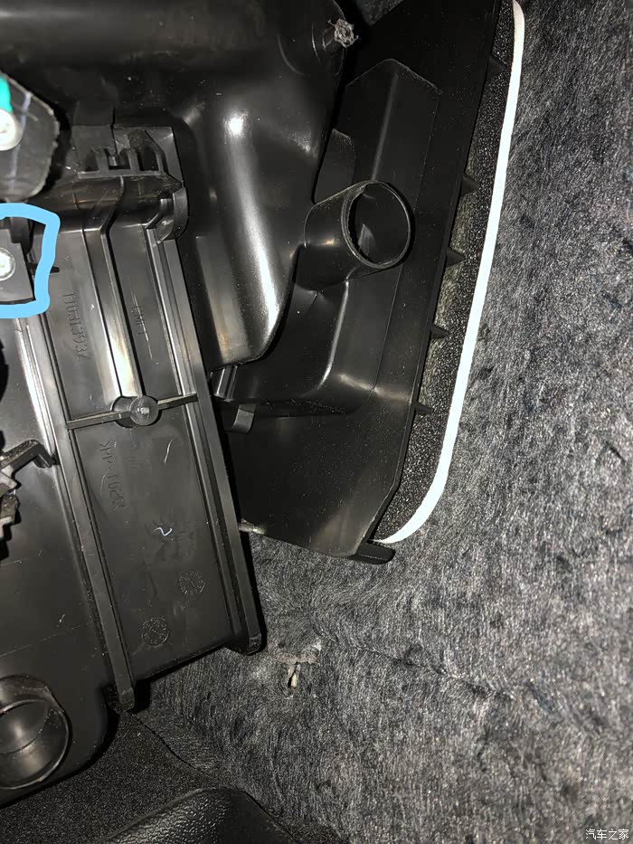 空调滤外壳有颗内六角梅花螺丝固定住,蓝色标注出,姿势太辛苦了,角度拍摄不全,我就纳闷了,为什么要用这么特殊的螺丝,用一字螺丝或者十字螺丝他不香吗?幸好我也有一组内六角梅花螺丝刀,用着极度不舒服又累的姿势拧开了这颗螺丝。