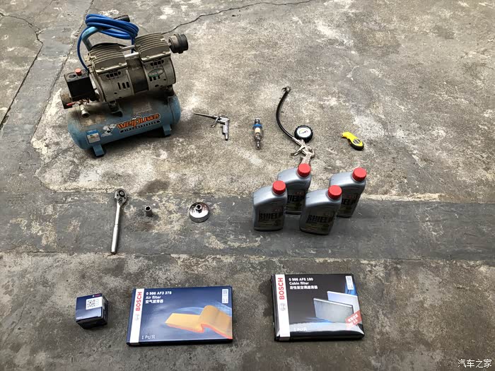 首先介绍一下所需工具,由上至下左至右分别是:空压机,风枪,油水分离器,轮胎充气枪,轮胎电子气压计,套杆,14套筒,901机油滤芯帽,0W-20全合成机油,机油滤芯,空气滤芯,空调滤芯。