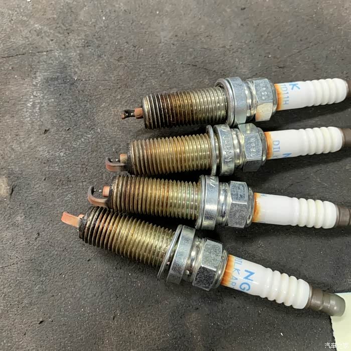 很快,师傅就把四个火花塞都给拆下来,师傅说它们的状态类似,点火电极位置基本没积碳,说明每个缸的燃烧都比较好。