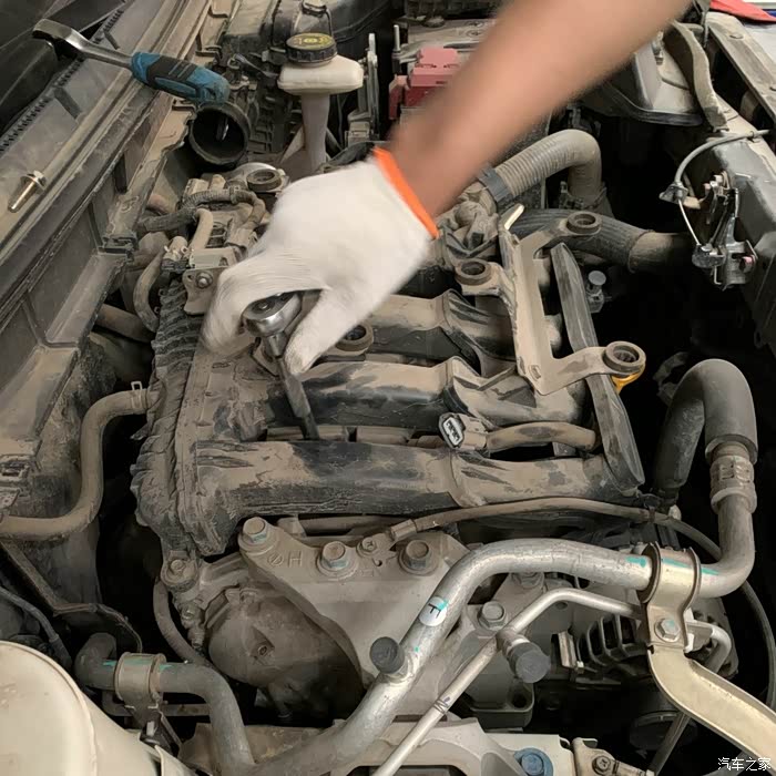 点火线圈的拆卸很容易,这款发动机点火线圈的设计比较好,刚好在进气歧管缝隙之间,如下图箭头所示,这不像老款HR16发动机那样,需要把进气歧管拆下才能取掉点火线圈。