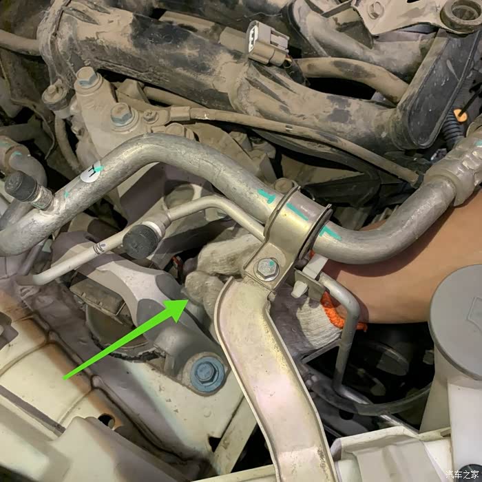 四个火花塞都安装之后,师傅把之前拆下的点火线圈等都安装好,随后启动发动机,一切正常。只是,师傅又说发动机上的一个配件有问题,也就是下图所示的这个部件,师傅说它叫机脚,连接发动机和车身,中间是橡胶连接,可以减弱发动机的震动,但是现在中间的橡胶变形,间距变小,一个小吸管能塞进去。下图所示,师傅正在往机脚里面塞吸管。