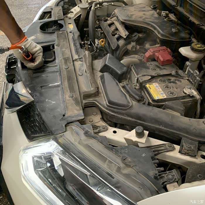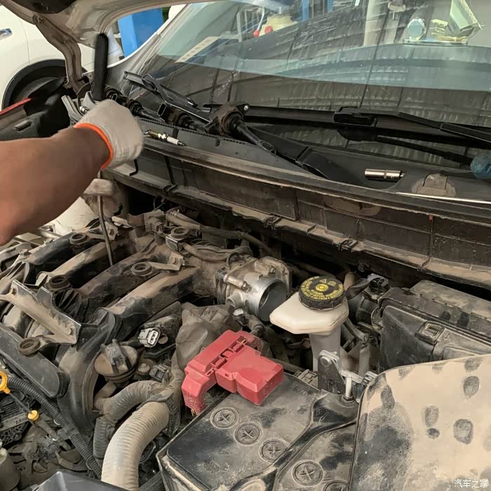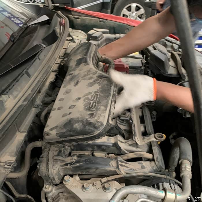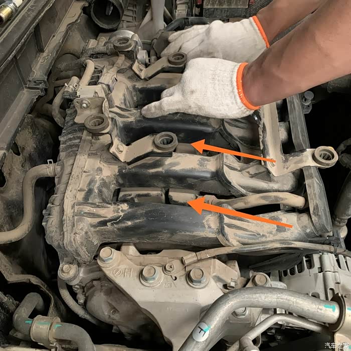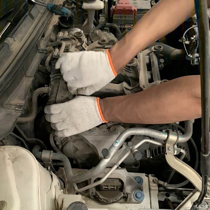 我把车开到修理厂后,上次保养的师傅接车,他先把发动机上部的进气管道等都拆下,再把节气门前部的进气管道拆下。