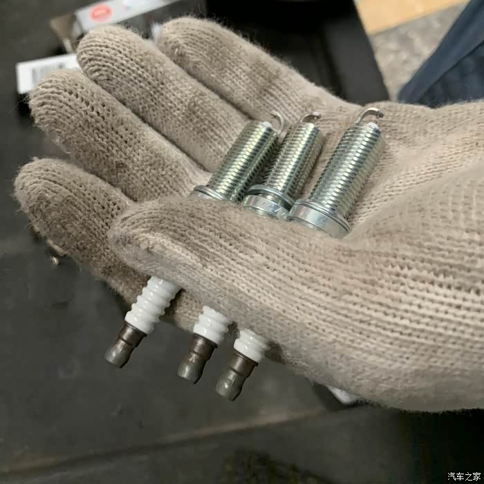 换什么样的火花塞呢?我要求的必须是原厂火花塞,同一个牌子,都是NGK,型号也必须一样,图中所示的是其中三个火花塞,另一个已经被师傅安装上。