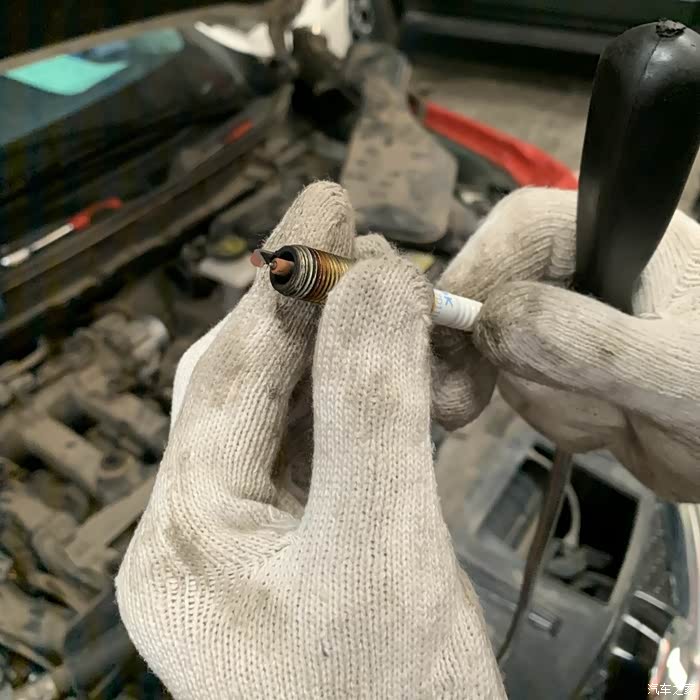 拧了一会儿就拆下一个火花塞,如图所示,师傅说火花塞还能用,但是状态已经不好,也该换了。