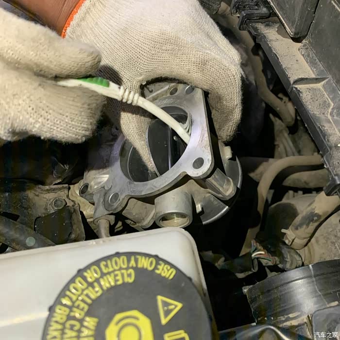 在师傅拆进气管道时,我去了一趟厕所,也就五分钟左右,回来时就看到师傅正在清洗节气门。本以为师傅会把节气门全拆下来清洗,没想到师傅只是把节气门的固定螺丝拆下,在车上清洗。