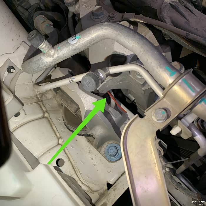 下图所示,吸管刚好能被师傅塞进机脚里面。这说明机脚内部橡胶变形严重,机脚的刚性结构距离过近,这会使发动机的震动能直接传递到车内,方向盘就会表现出轻微震动。这只有换一个新机脚才能解决问题。