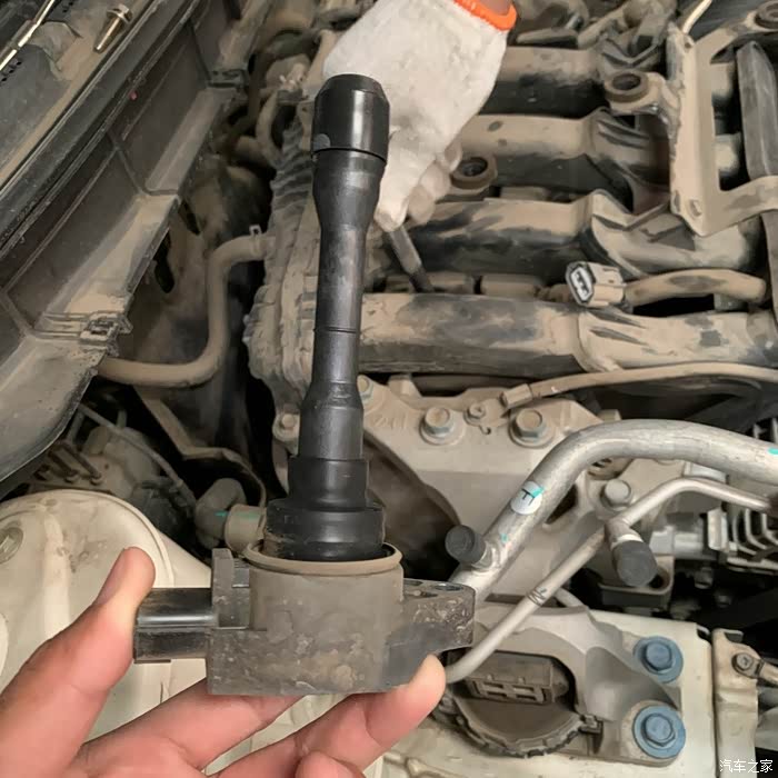 如图所示,这就是拆下来的点火线圈,师傅说它很少会出问题,没有规定的更换里程,有问题就换,没问题就不用管,而火花塞不一样,火花塞是需要按照规定更换,不按照规定更换也能用,但是会影响油耗和动力等。由于发动机刚熄火,它的温度非常高,我摸了一下就赶紧放下来。