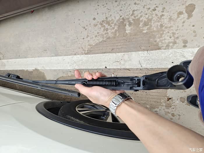 第14步,雨刮臂取出后整体是这样的,底下一个弹簧拉住将雨刮条平整的挂在玻璃上,所以取出的时候需要克服弹簧力。